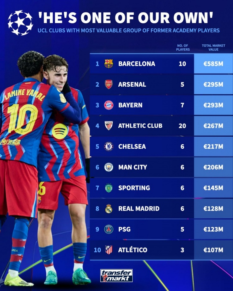 欧冠球队青训球员总身价:巴萨5.85亿居首,皇马第8