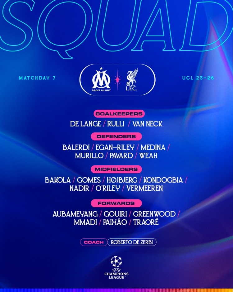 🆚利物浦!马赛欧冠名单:奥巴梅扬领衔,埃莫森伤缺