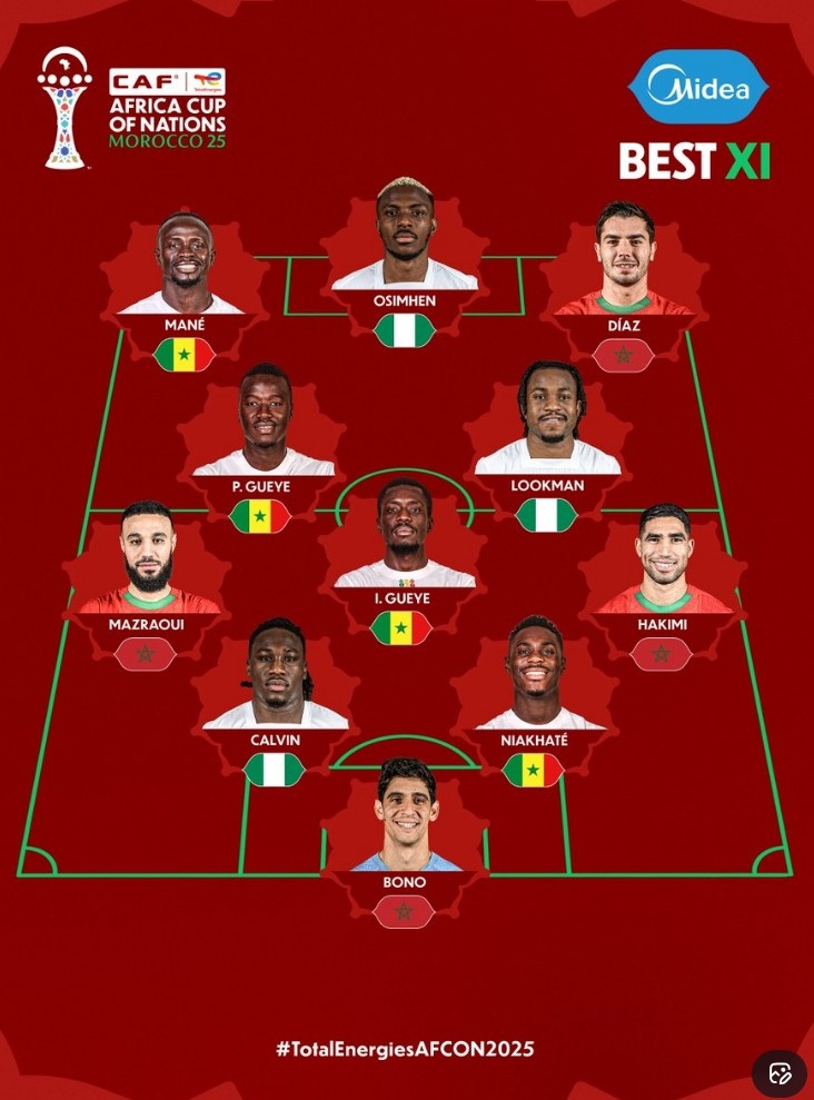 ✨️非洲杯官方晒赛事最佳阵容:迪亚斯、奥斯梅恩领衔