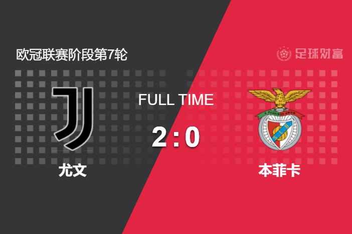 最终全场比赛结束,尤文主场2-0击败本菲卡。