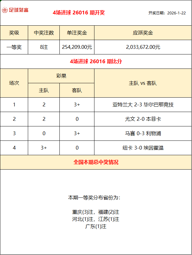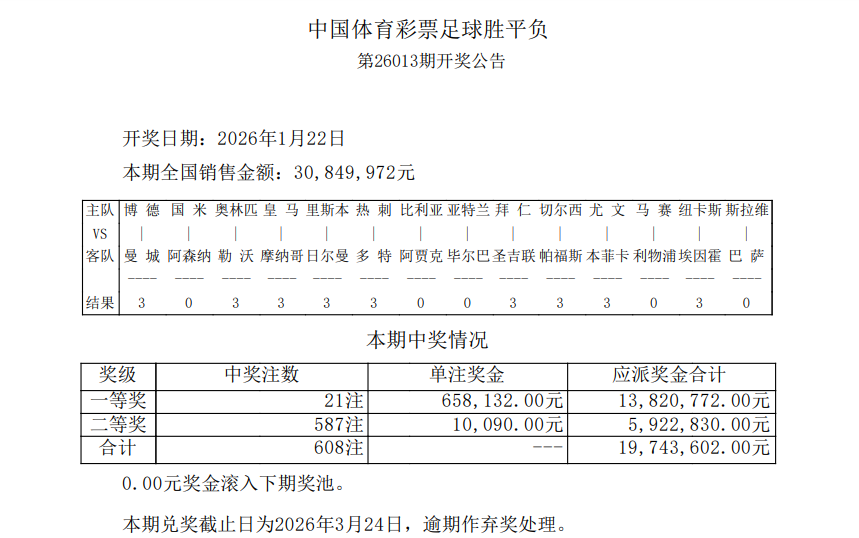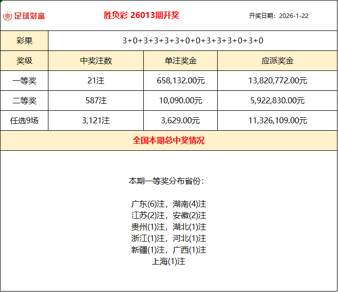 胜负彩26013期开奖:曼城爆冷负!头奖21注65.8万