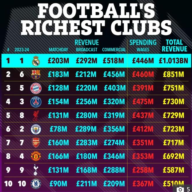 皇马成为历史上首家单赛季收入突破10亿英镑大关的足球俱乐部,高居榜首。紧随其后的是巴萨、拜仁和巴黎圣日耳曼。