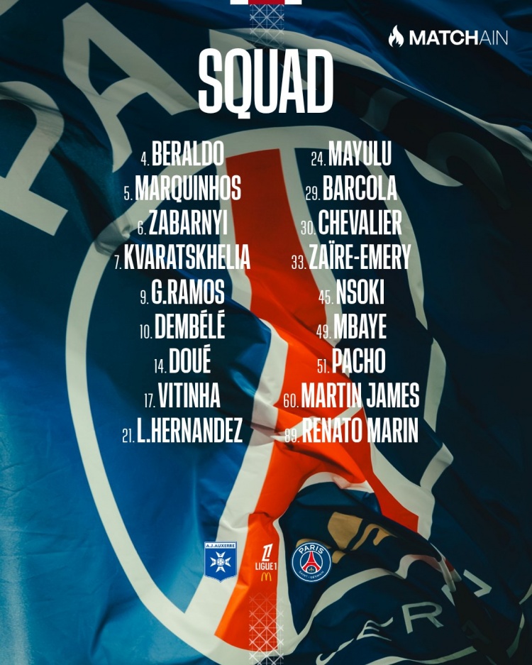 本场比赛,法比安·鲁伊斯、内维斯、努诺-门德斯、阿什拉夫缺席,卢卡斯、姆巴耶回归。