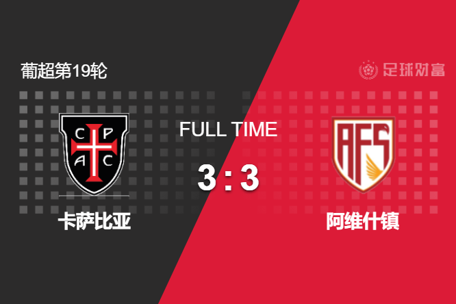 最终全场比赛结束,阿维什镇让三追三,客场神奇绝平卡萨比亚。