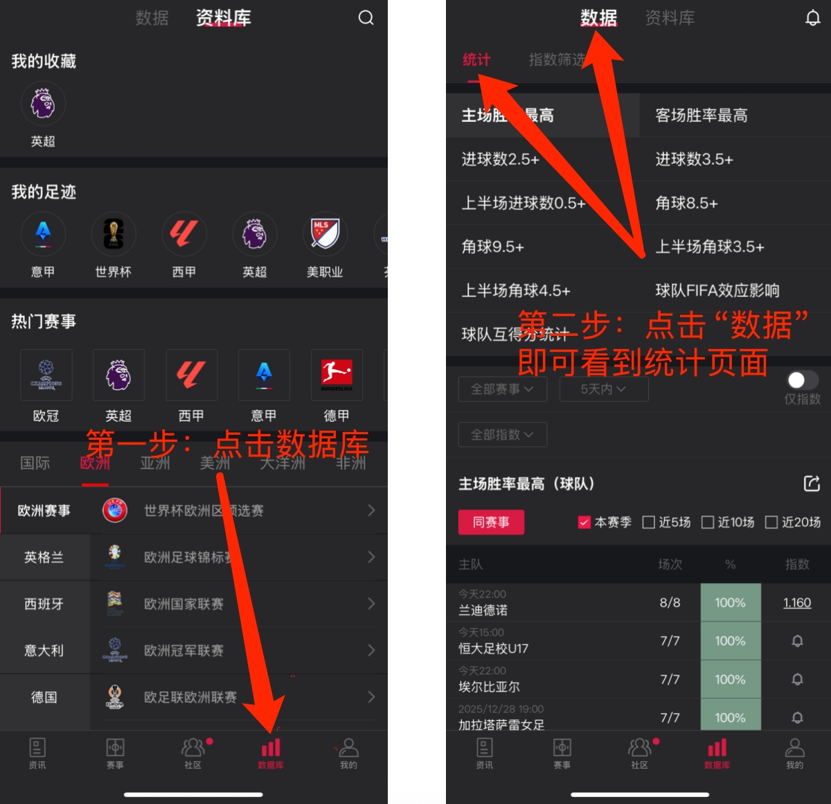 查看更多赛事统计,可以点击右下角【数据库】→【数据】→【统计】,目前支持:主场龙、客场龙、主场虫、客场虫、角球、进球、FIFA病毒、球队互得分等一系列数据,未来会继续增加以供参考。