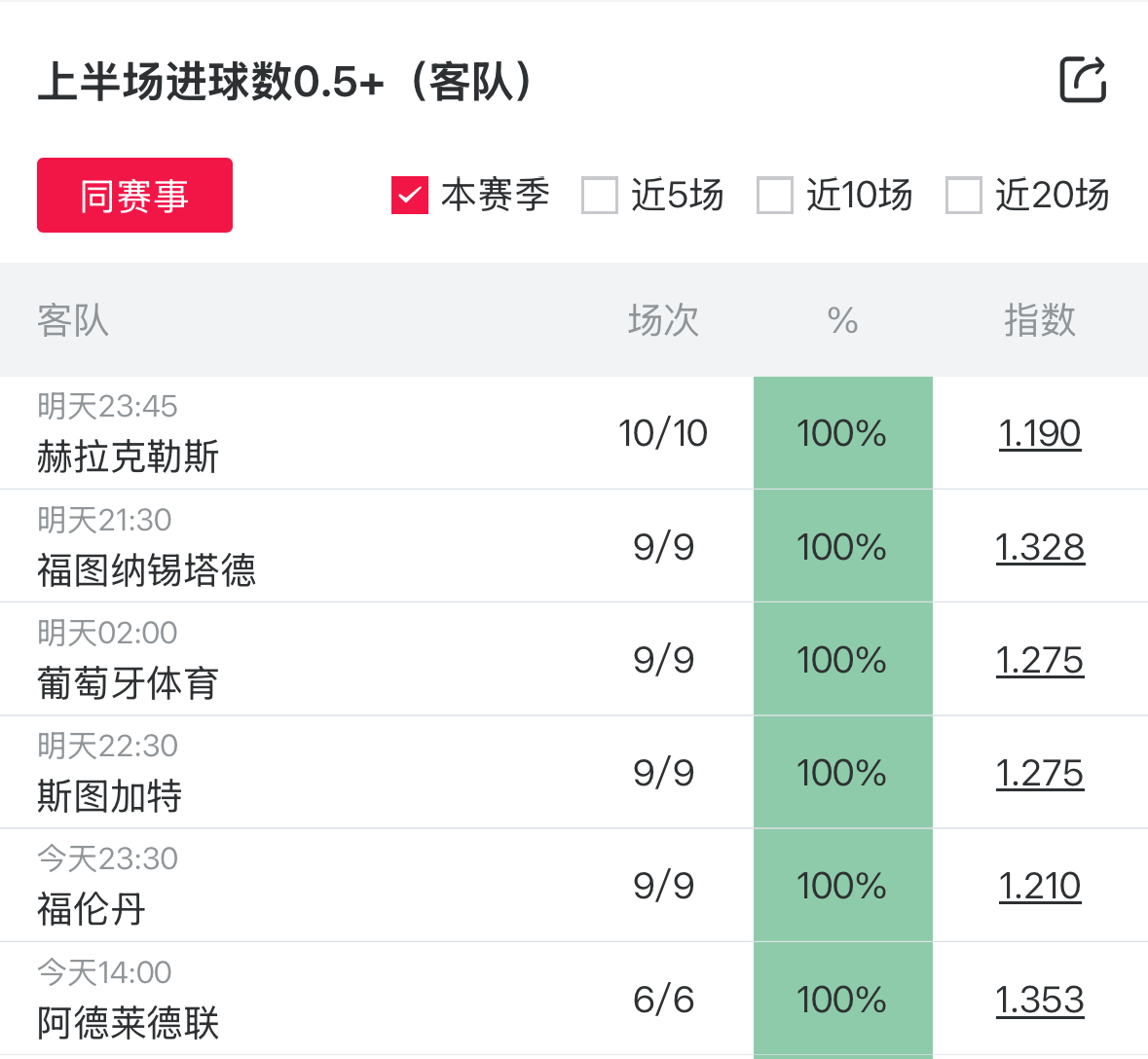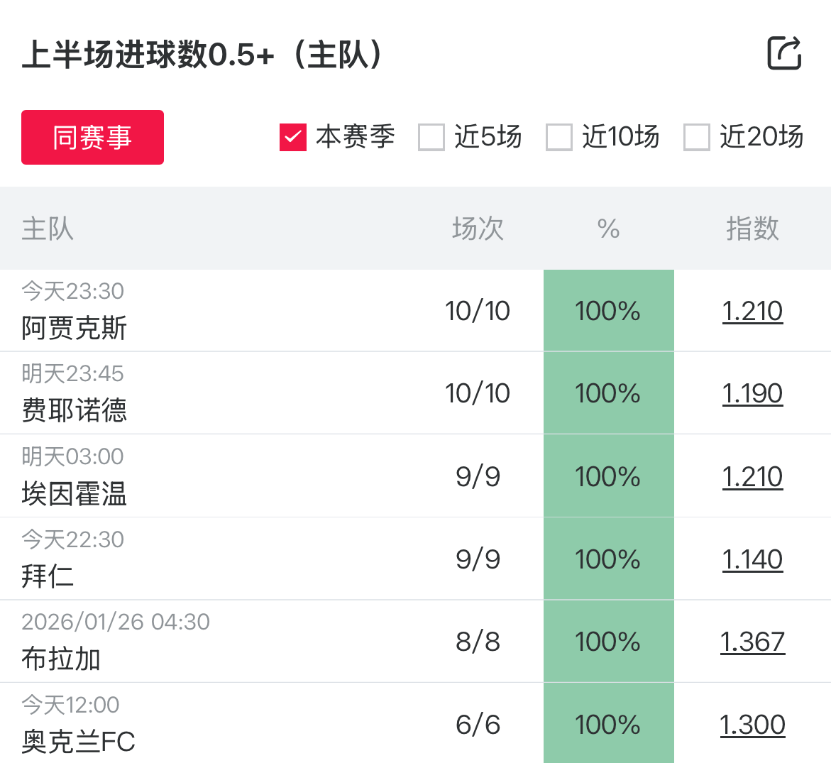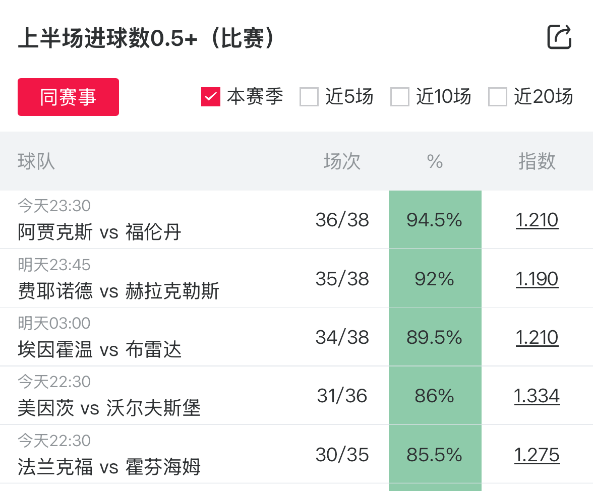 未来48小时内的竞足赛事中,有10场比赛主队/客队本赛季上半场进球概率保持100%,涉及比赛包括阿贾克斯vs福伦丹、费耶诺德vs阿尔梅罗大力神、埃因霍温vs布雷达、拜仁vs奥格斯堡等,值得关注。