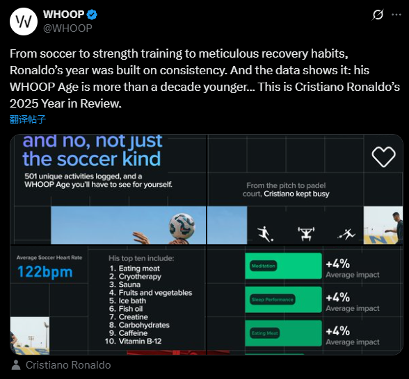 持续性的习惯胜过健康技巧,C罗每天都通过Whoop纪录,帮助自己减缓衰老速度,他的日常恢复有冰浴、补水、呼吸练习、食物、关键补充剂。