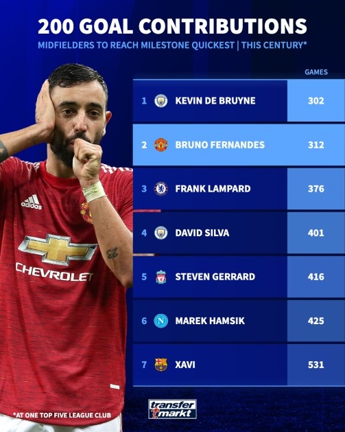德转市场盘点了新世纪五大联赛最快直接参与200球中场球员,其中德布劳内用了302场比赛排名第一,B费排名第二。