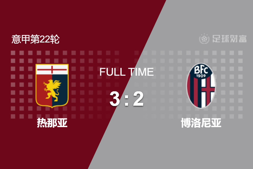 最终全场比赛结束,热那亚主场让二追三,击败了博洛尼亚。