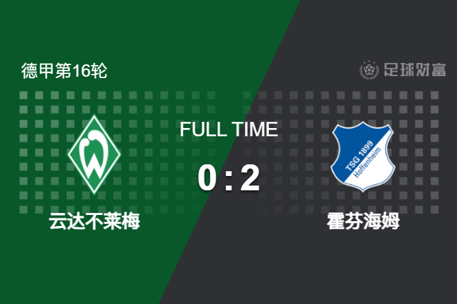 最终全场比赛结束,十人霍芬海姆客场2-0战胜云达不莱梅。