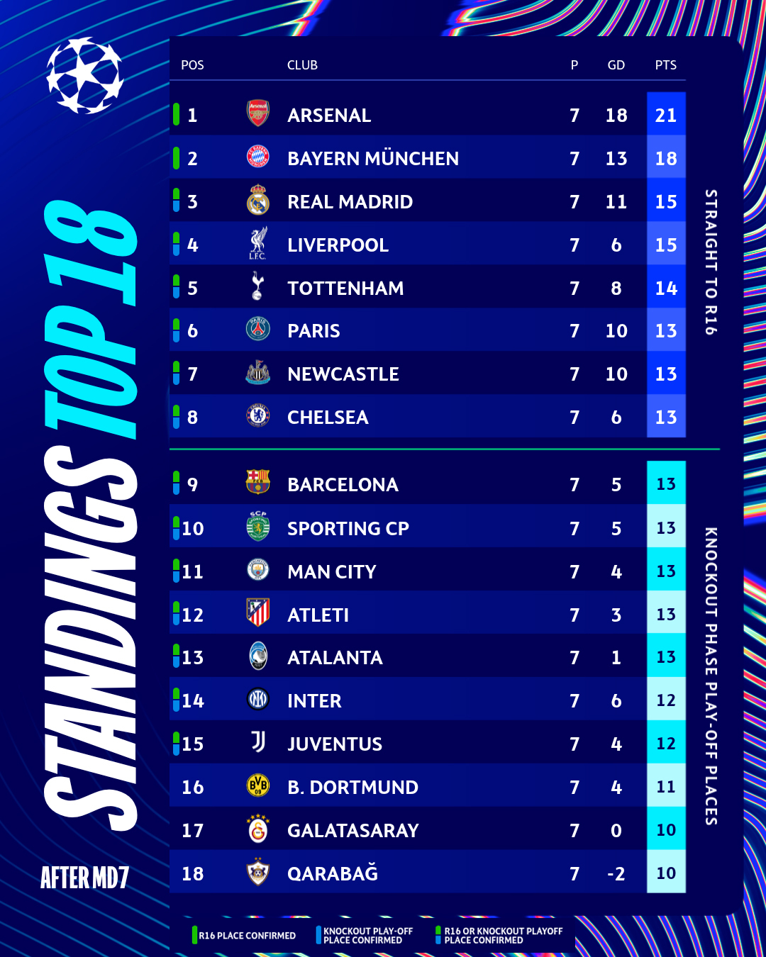 欧冠联赛阶段积分榜(前8名直通,9-24名参加2回合淘汰赛附加赛)↓