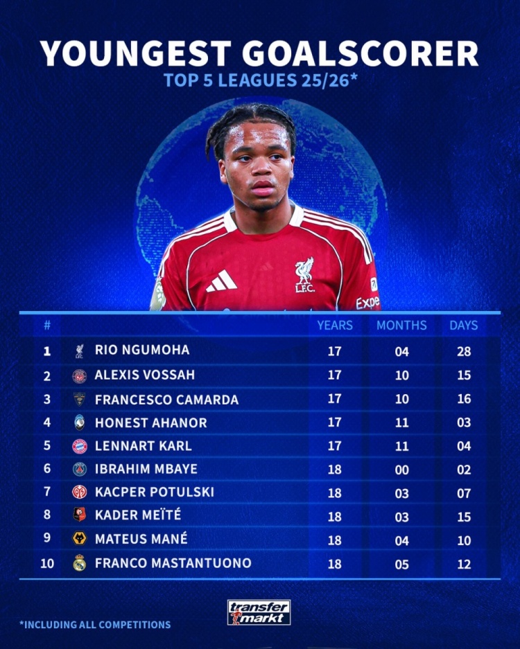 德国转会市场网站盘点了五大联赛最年轻进球球员,其中利物浦小将恩古莫哈排名第一。