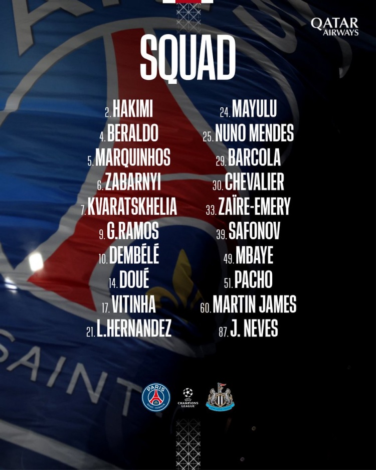 北京时间1月29日凌晨,欧冠联赛阶段第8轮焦点战,巴黎圣日耳曼坐镇主场迎战纽卡斯尔联。赛前,大巴黎公布本场比赛大名单,李刚仁、法比安·鲁伊斯伤缺,阿什拉夫回归,登贝莱、杜埃、巴尔科拉、科瓦拉茨赫利亚领衔出战。