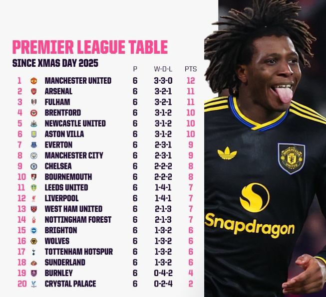 数据显示,自圣诞节至今,曼联在6场联赛中取得了3胜3平的不败战绩,累积拿到12个积分,是同期所有英超球队中拿分最多的。紧随其后的是阿森纳和富勒姆,两队同积11分。布伦特福德、纽卡斯尔联和阿斯顿维拉则以10分位列第二梯队。