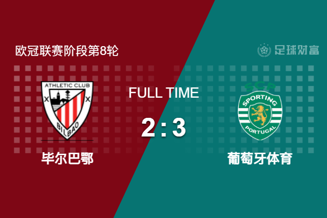 最终全场比赛结束,毕尔巴鄂竞技主场2-3不敌葡萄牙体育,毕巴欧冠出局,葡体直通16强!