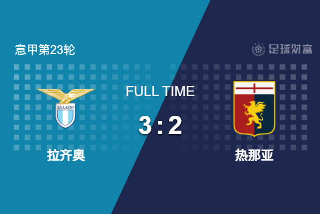 最终全场比赛结束,拉齐奥主场3-2险胜热那亚。