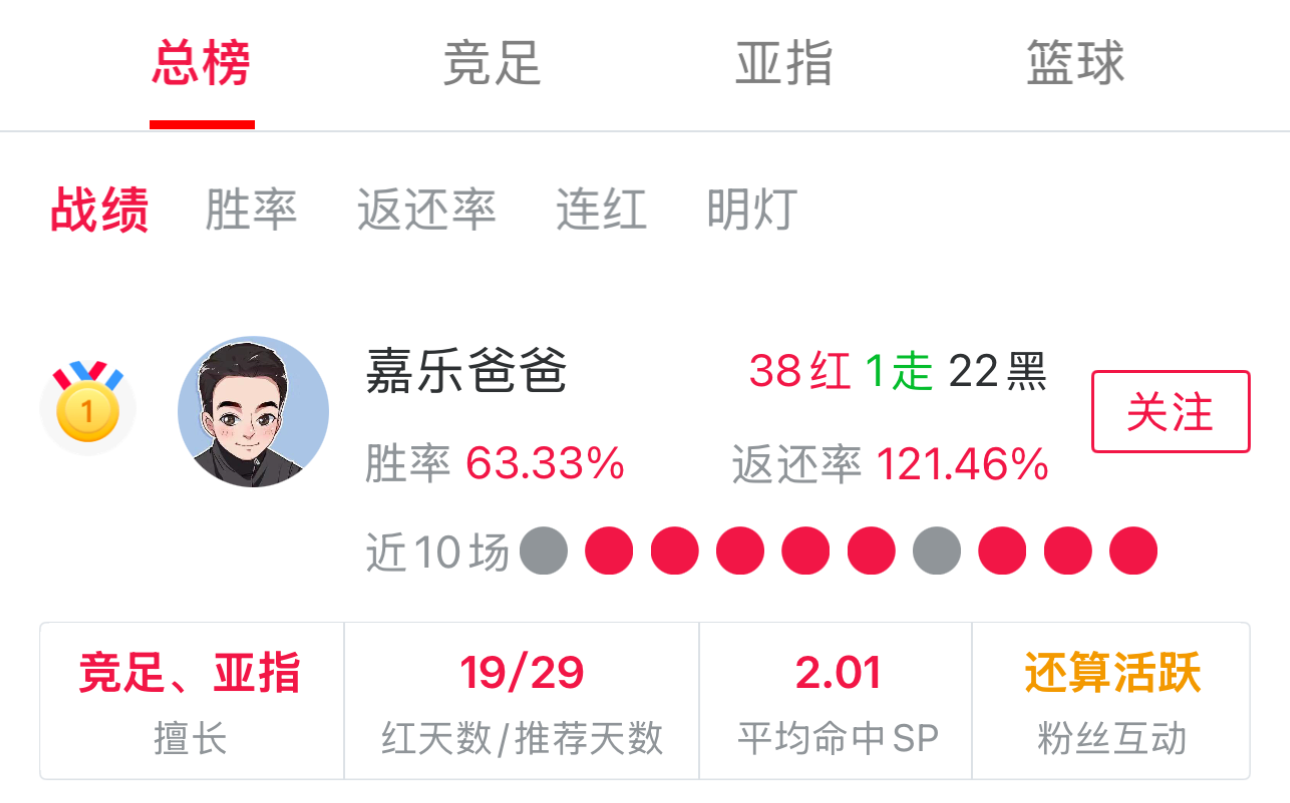 用户嘉乐爸爸 目前战绩排名总榜第一,近7日胜率高达88.9%可谓状态十分出色。他个人十分擅长意甲联赛和德甲联赛,让我们期待他将良好的状态进行延续。