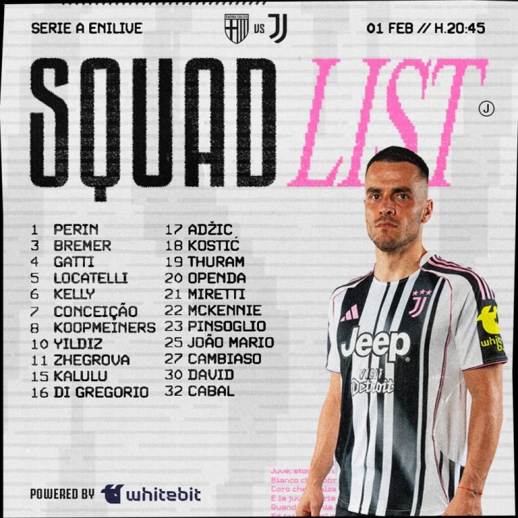 北京时间2月2日凌晨3点45,尤文将在意甲联赛第23轮客场挑战帕尔马,赛前尤文公布本轮联赛大名单,弗拉霍维奇继续因为内收肌问题缺席,伊尔迪兹、奥蓬达、图拉姆、加蒂、卡卢卢悉数入选。