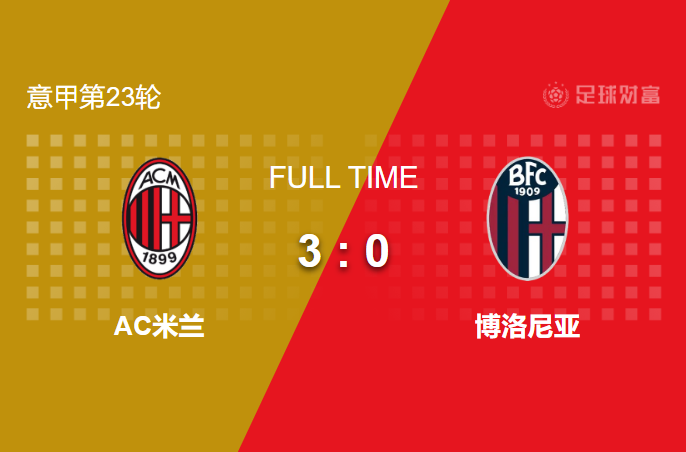 最终全场比赛结束,AC米兰客场3-0大胜博洛尼亚。