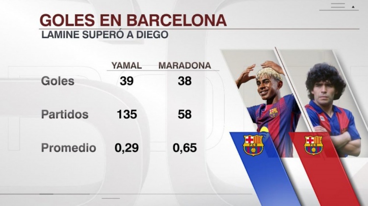 超越传奇!亚马尔为巴萨打进39球,超越38球的马拉多纳
