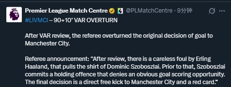 英超官方随后对这一关键判罚作出了解释,声明VAR介入后推翻了最初的进球判罚。裁判现场宣布,回放显示哈兰德在进攻过程中有拉拽球衣犯规,而在此之前索博斯洛伊对哈兰德也有一次拉拽犯规,并因此破坏了一次明显的得分机会。