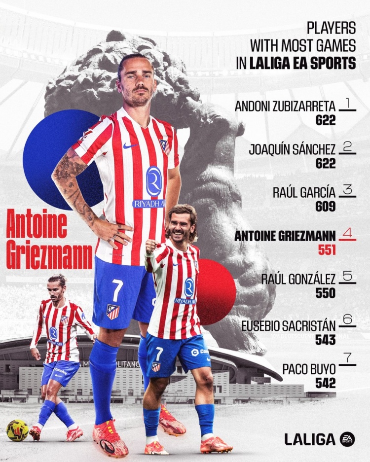 格列兹曼达成西甲551场里程碑!超越劳尔升至历史第4位