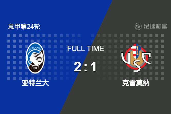 最终全场比赛结束,亚特兰大主场2-1击败克雷莫纳,亚特兰大连续7轮不败(5胜2平)。