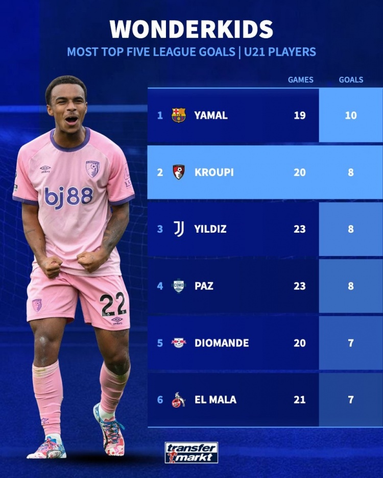 近日,德国转会市场统计出了本赛季五大联赛U21球员射手榜,巴萨前锋亚马尔以10球排名榜首,克鲁皮、伊尔迪兹、尼科-帕斯三人打入8球。