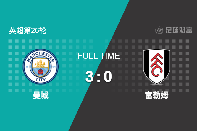 最终全场比赛结束,曼城主场3-0完胜富勒姆,多赛一场距离榜首阿森纳相差3分。