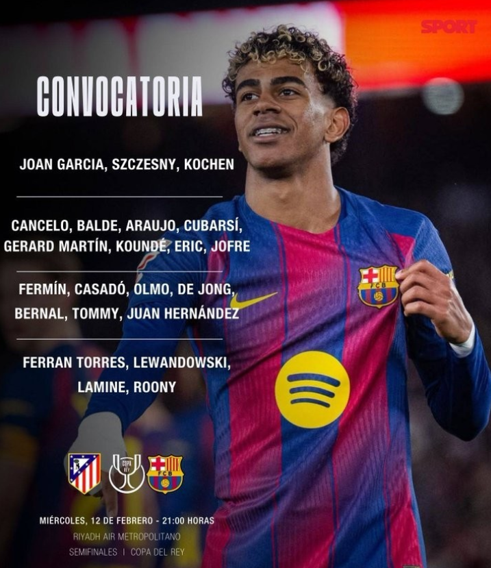 北京时间2月13日凌晨4点,国王杯半决赛首回合即将打响,巴萨客场对阵马竞。赛前,巴萨官方公布球队大名单,拉菲尼亚、拉什福德、佩德里、加维、克里斯滕森均因伤缺席。