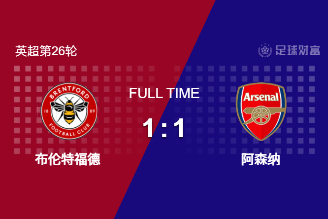 最终全场比赛结束,阿森纳客场1-1战平布伦特福德。