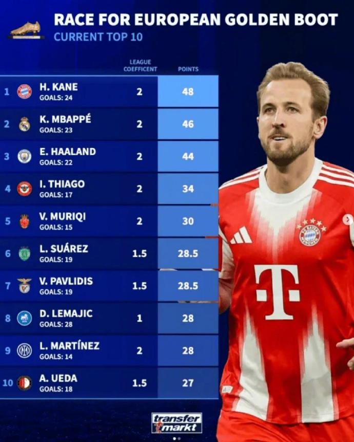 近日,德转更新了本赛季欧洲金靴奖最新积分排名,凯恩今天凌晨完成双响,以24球积48分领跑,姆巴佩与哈兰德排名前三,排名第4位的是布伦特福德中锋伊戈尔·蒂亚戈。榜单前十中还包括马略卡的穆里奇(15球30分)、葡超双雄葡萄牙体育的苏亚雷斯与本菲卡的帕夫利季斯(各19球28.5分),以及来自拉脱维亚联赛的莱马伊奇(28球28分)。
