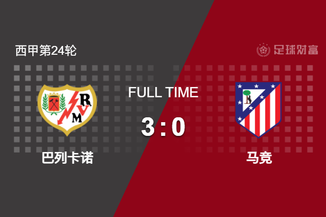 最终全场比赛结束,巴列卡诺3-0完胜马竞逃离降级区,马竞遭遇联赛三轮不胜。
