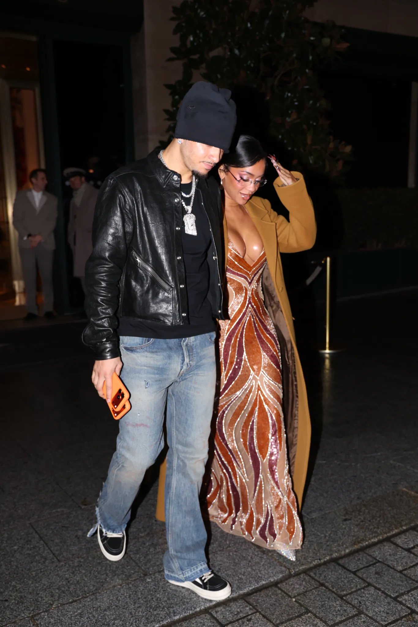 桑乔被抓拍到一身休闲黑装,戴着冷帽,而32岁的莎维蒂则身着棕色外套与低胸马赛克图案连衣裙,半球若隐若现惊艳众人。