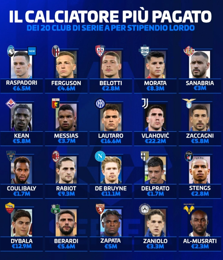 意甲20队队内顶薪球员榜:DV9第一!劳塔罗、迪巴拉上榜