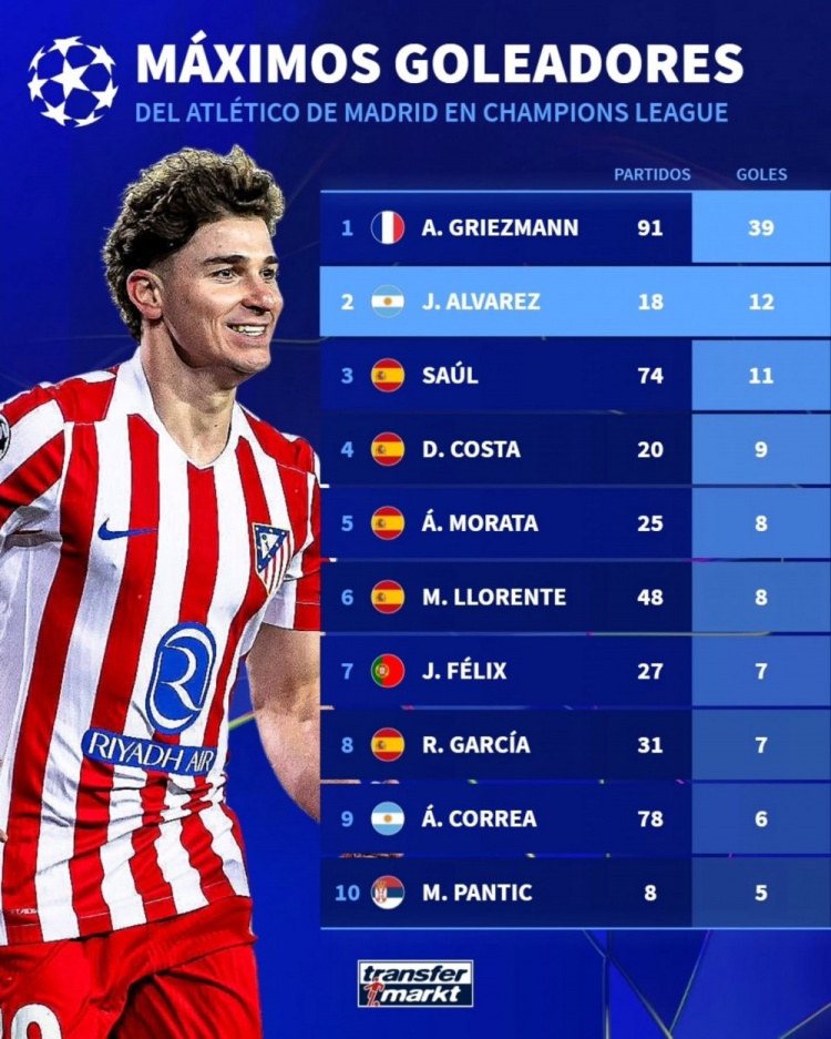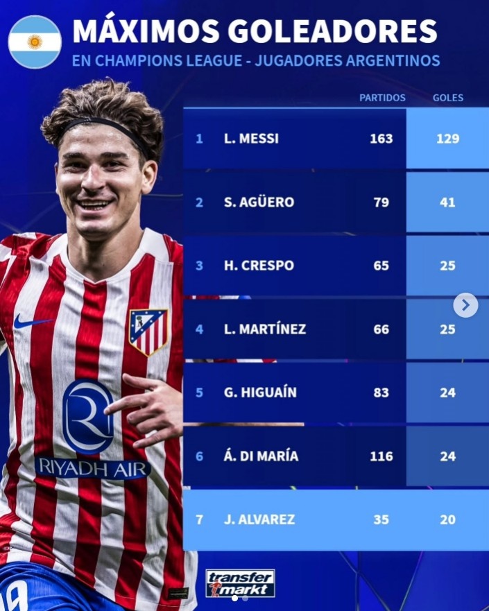 欧冠淘汰赛附加赛首回合,马竞3-3战平布鲁日,阿尔瓦雷斯打进1球。赛后,德转统计了两项欧冠进球榜单,在马竞队史欧冠射手榜上,法国前锋格列兹曼以91场39球遥遥领先,阿尔瓦雷斯仅用18场便打入12球,位列队史第二。在阿根廷球员欧冠历史射手榜上,梅西以163场129球断崖式领跑,阿尔瓦雷斯以35场20球强势跻身榜单第七。