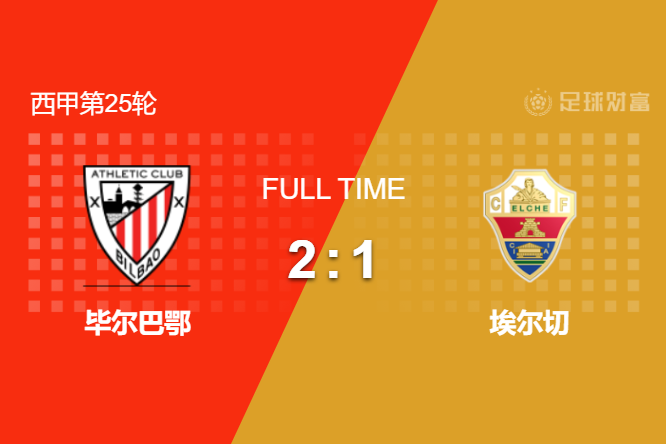 最终全场比赛结束,毕尔巴鄂主场2-1绝杀埃尔切。