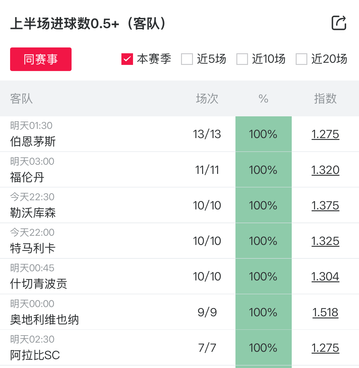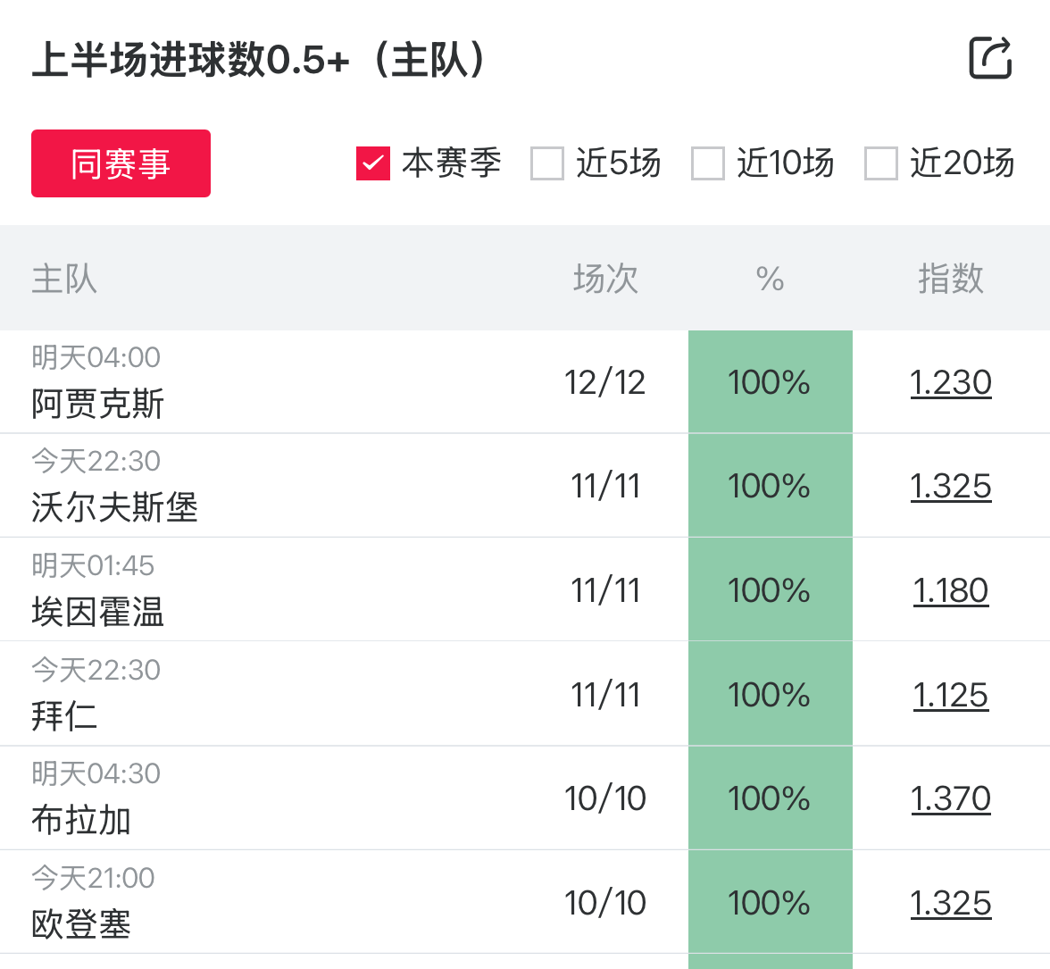 13场概率达到100%!周日上半场进球数0.5+场次提醒