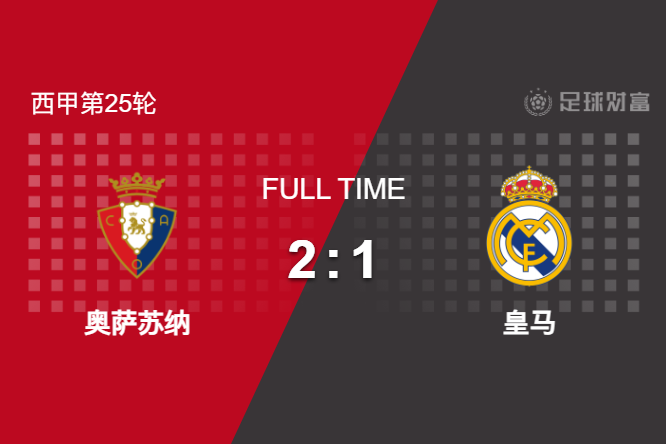最终全场比赛结束,皇马客场1-2不敌奥萨苏纳,皇马目前多赛一场领先第二名巴萨2分。