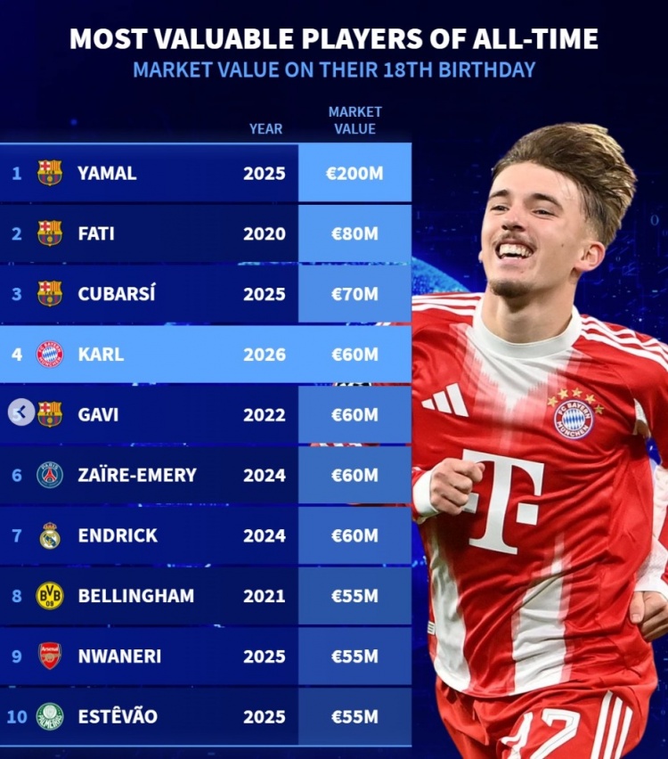 💹德转18岁球员历史身价榜:亚马尔2亿居首,巴萨4人入选