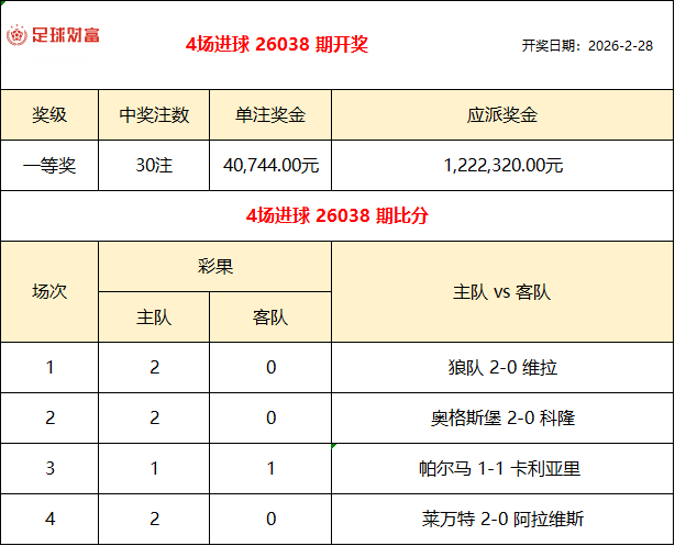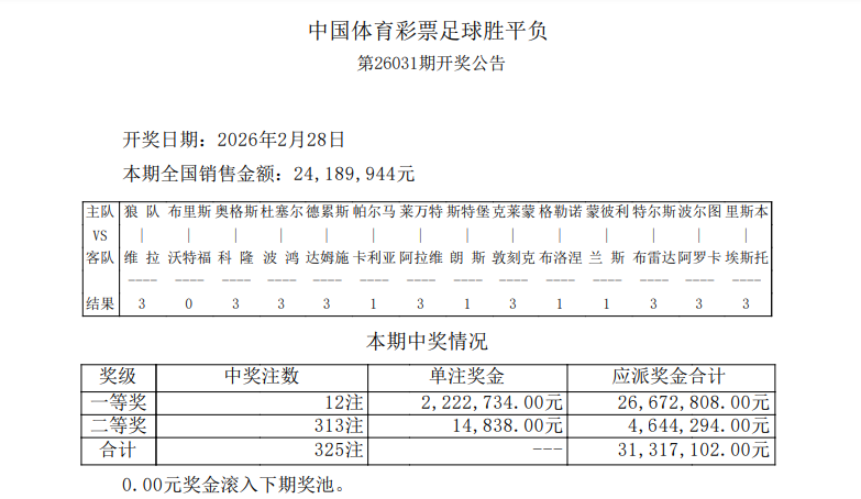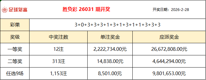 胜负彩26031期开奖:维拉爆冷负垫底队!头奖12注222万