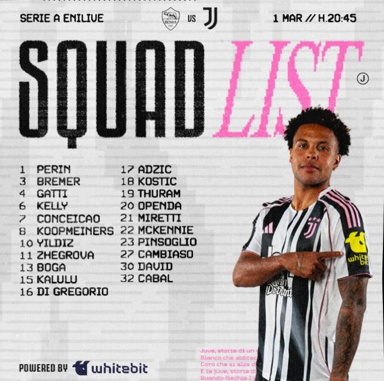 北京时间3月2日凌晨3点45,尤文将在意甲第27轮客场挑战罗马,赛前尤文公布本场比赛大名单,弗拉霍维奇继续因伤缺席,伊尔迪兹、布雷默、卡卢卢等人入选。