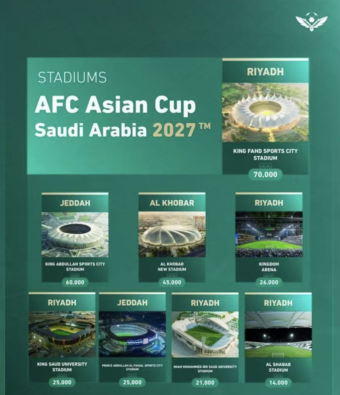 2027年沙特亚洲杯将在利雅得、吉达以及胡拜尔三座城市举行,可容纳72000人的利雅得法赫德国王体育城体育场将承办揭幕战以及决赛。