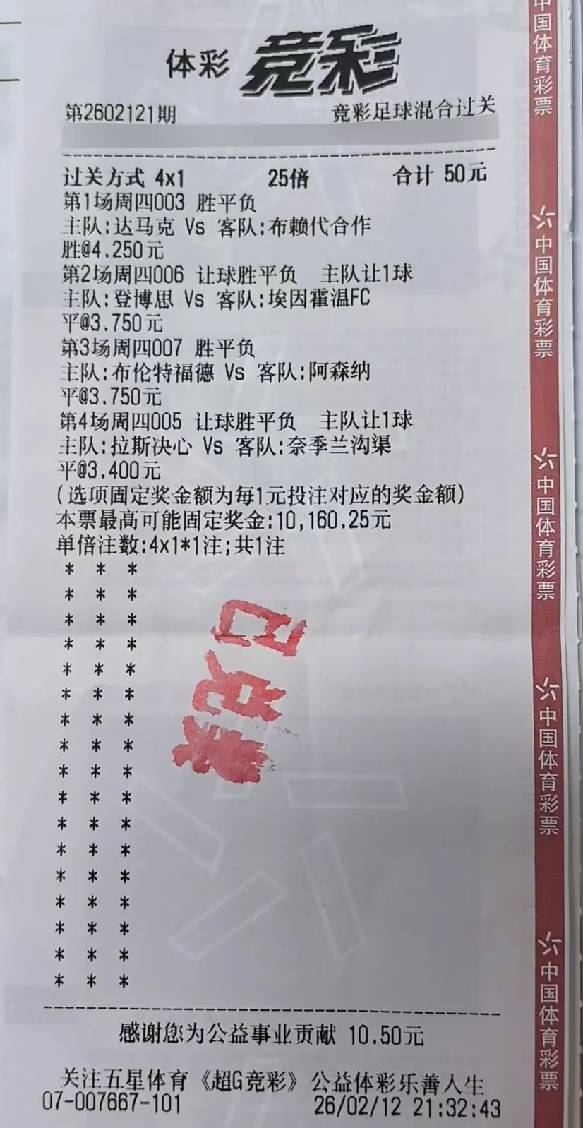 近日,上海市长宁区彩票晒出中奖单,单选25倍4串1命中1.1万奖金。大马克2-1布赖代:【胜平负】选(胜) SP值4.25拉斯决心2-1奈季沟渠:【让球胜平负】主(-1)选(平) SP值3.40登博斯2-1埃因霍温fc:【让球胜平负】主(-1)选(平) SP值3.75布伦特福德1-1阿森纳:【胜平负】选(平) SP值3.75