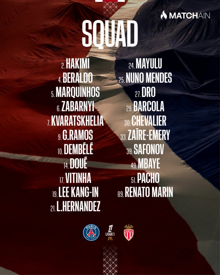 巴黎对阵摩纳哥大名单: