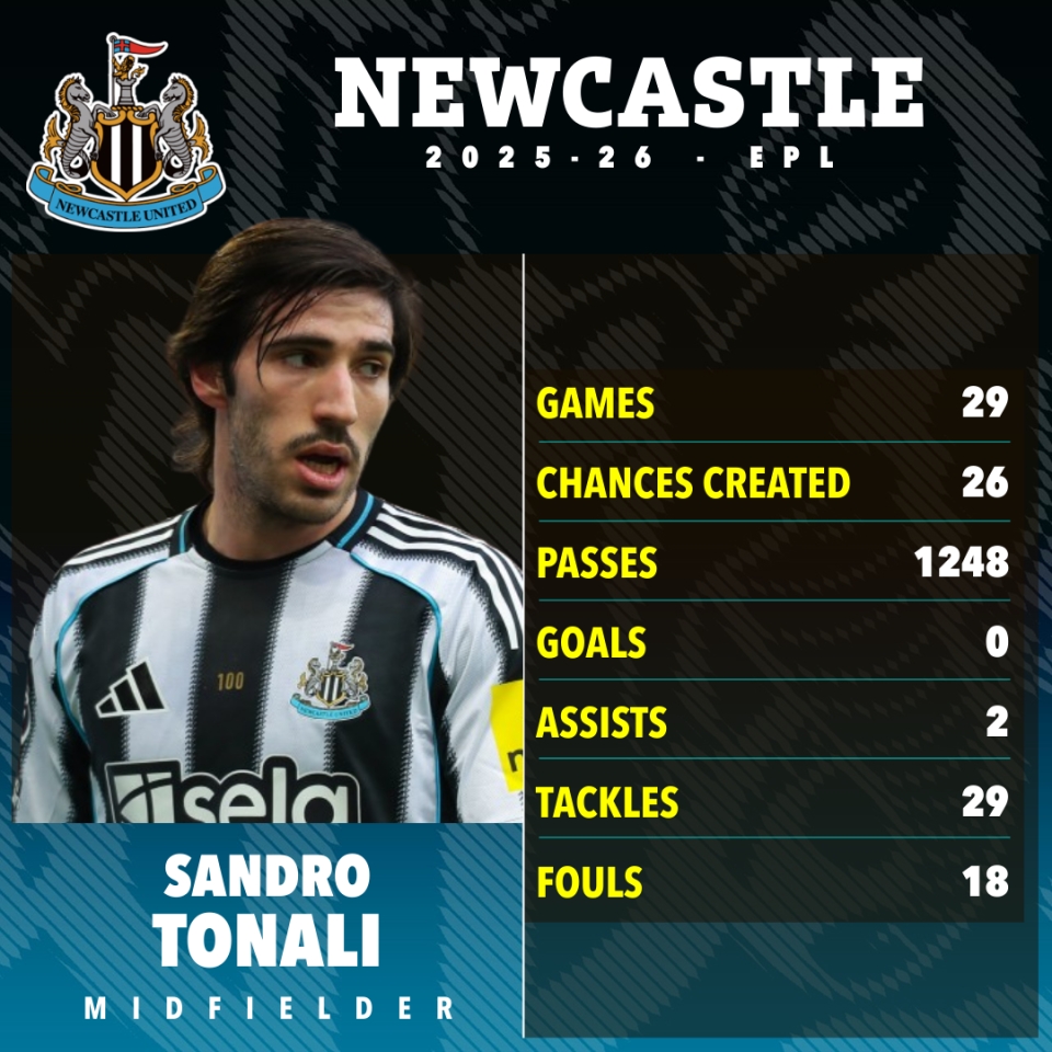 俱乐部在去年以1.3亿镑出售伊萨克后,已经决心不再失去核心,尽管经纪人曾淡化托纳利的离队传闻,但暗示3月份将重新定位球员价值,如果托纳利帮助意大利通过附加赛晋级世界杯,身价可能进一步上涨。