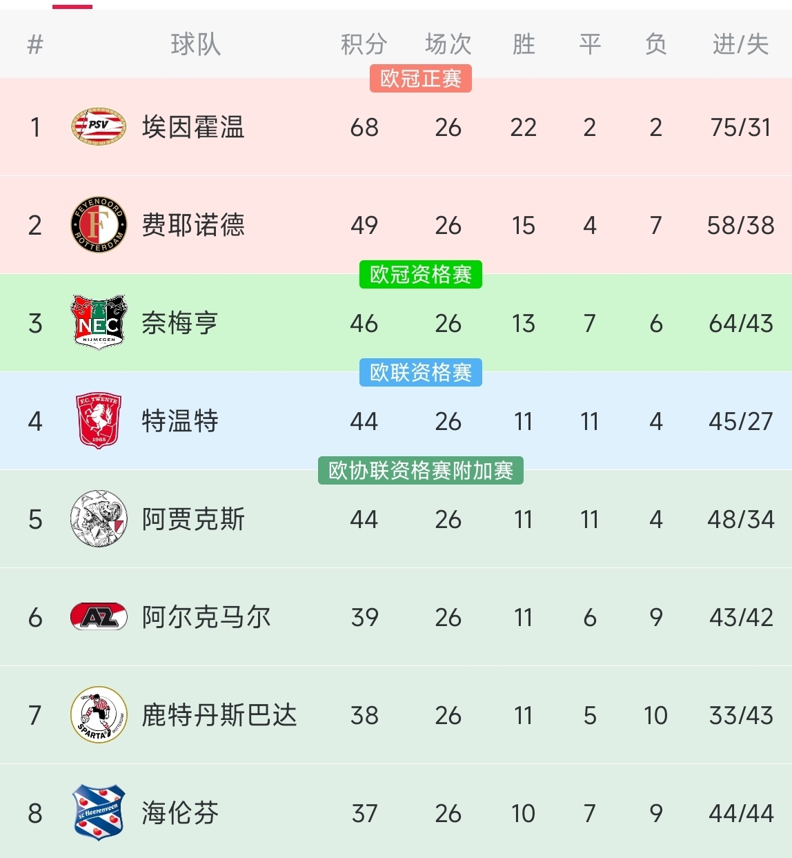 赛后相关数据统计,埃因霍温在本轮过后积68分领跑积分榜,高出第二名费耶诺德19分的优势。