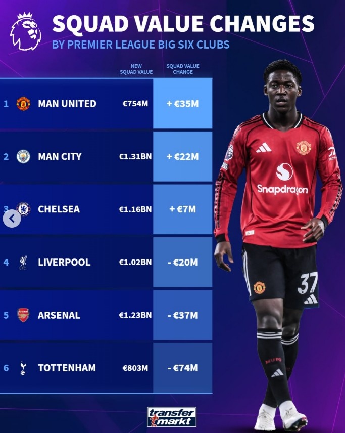 英超Big6身价变化:曼联涨3500万欧,热刺暴跌7500万欧