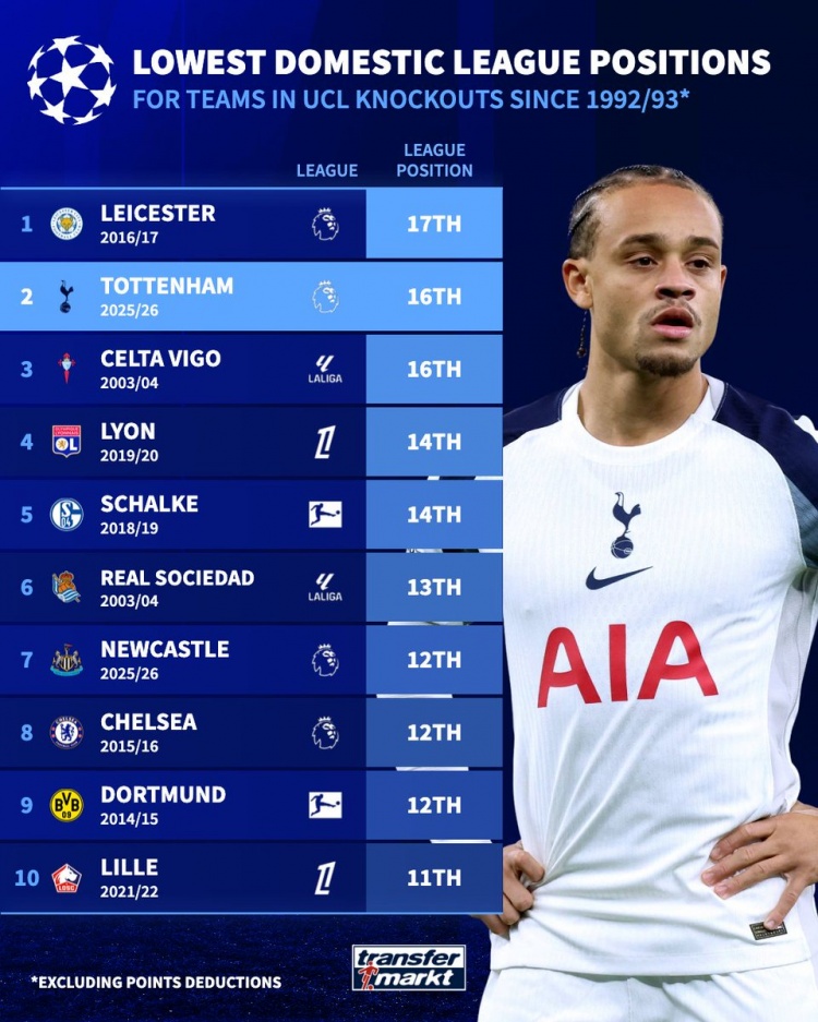 本周中,2025/26赛季欧冠1/8决赛首会合即将打响,赛前相关数据统计,自欧冠改制以来,本赛季晋级16强的热刺是联赛排名第二低的球队,仅次于2016/17赛季的莱斯特城。