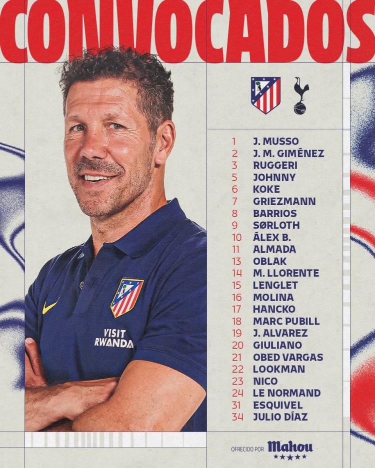 前锋:7-格列兹曼、9-索尔洛特、11-阿尔马达、19-阿尔瓦雷斯、20-朱利亚诺·西蒙尼、22-卢克曼、23-冈萨雷斯、34-胡里奥·迪亚斯